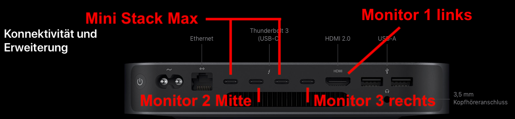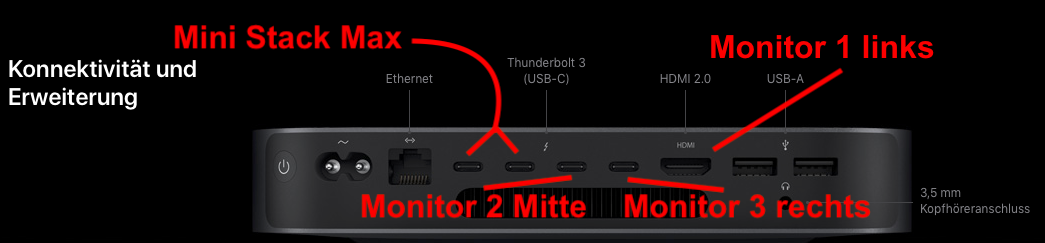 So trat es auch mit Big Sur weiterhin auf. Habe dann mal die Änschlüsse geändert. Ich dachte, das hätte ich auch früher schon mal versucht, bin mir aber mittlerweile nicht mehr sich. Zumindestens treten mit dieser Anordnung die Probleme nicht mehr auf: